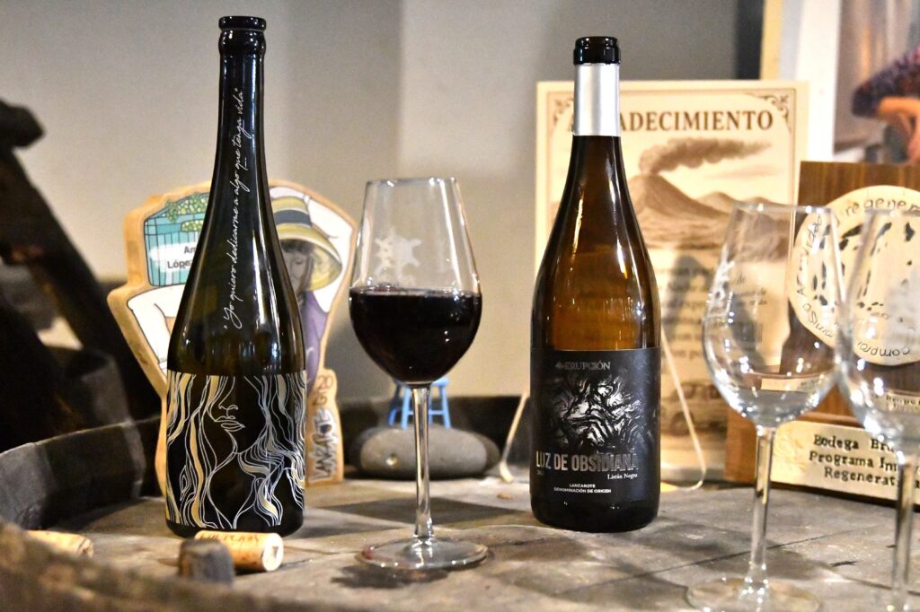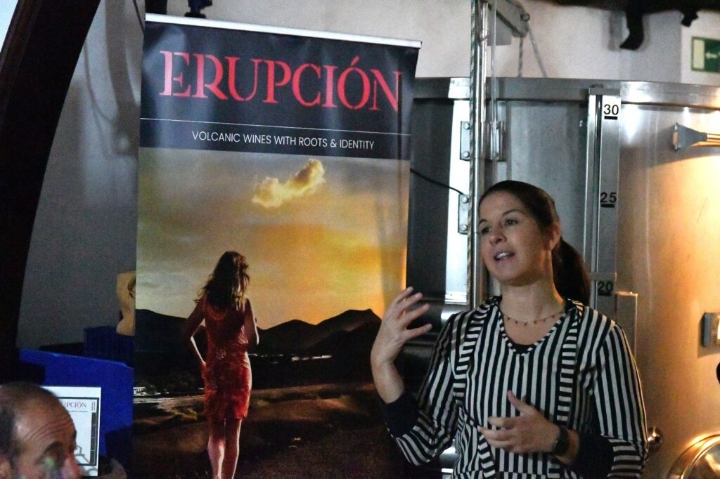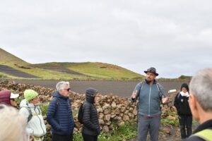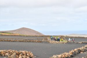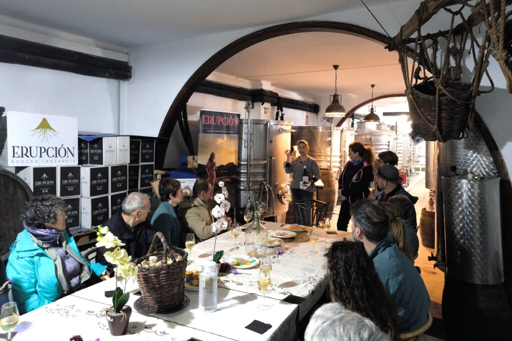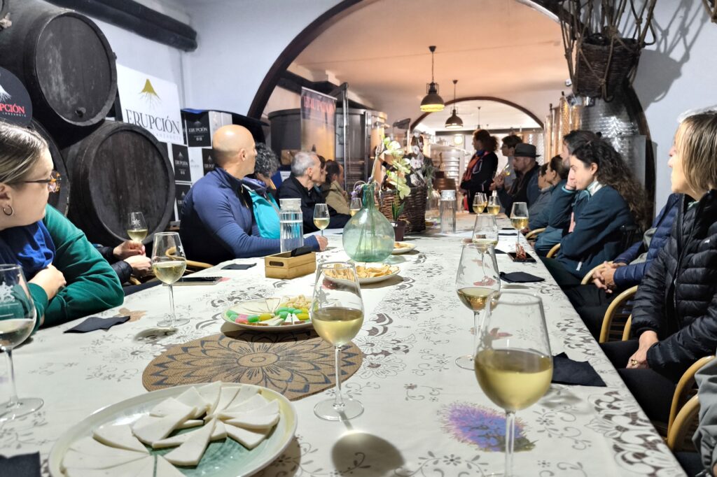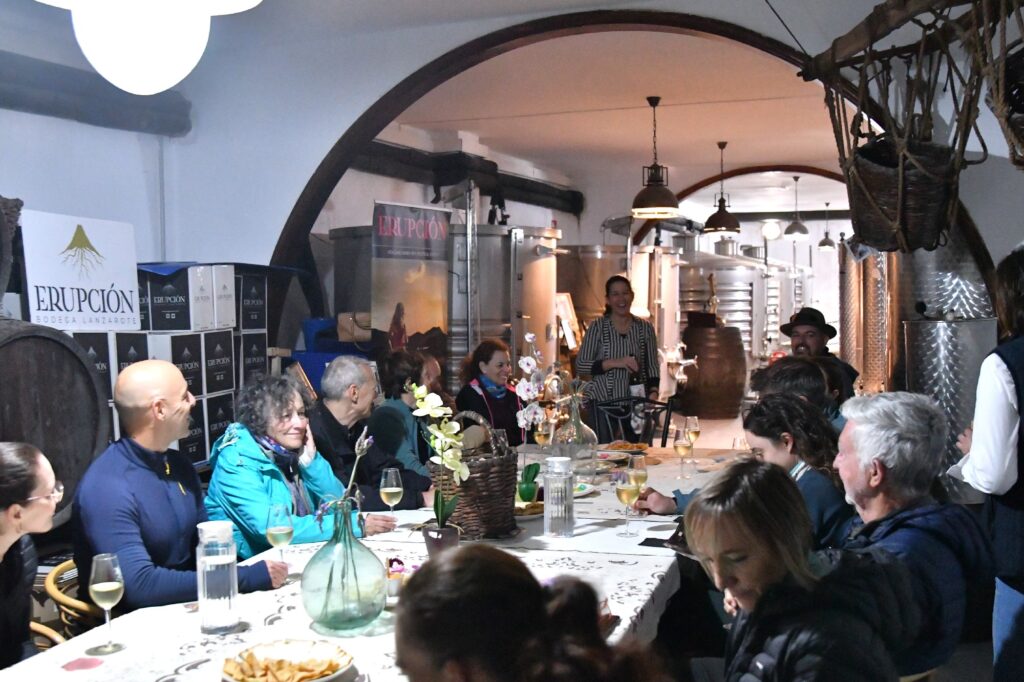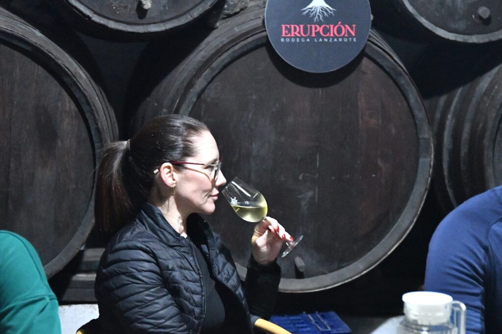 La ruta nos llevó también por Tiagua hasta llegar a El Jable, donde pudimos observar de cerca el último volcán que tuvo actividad en Lanzarote en 1824. Desde este punto tan simbólico pusimos rumbo a nuestro destino final: Bodega Erupción. Allí nos esperaba Amor López, enóloga y directora de este proyecto que representa un bonito relevo generacional. Con ella descubrimos más sobre su visión de la elaboración de vinos, la viticultura en la isla y los varietales autóctonos con los que da forma a sus joyitas enológicas. Y como toda buena ruta merece un gran final… llegó el momento de la cata 🍷