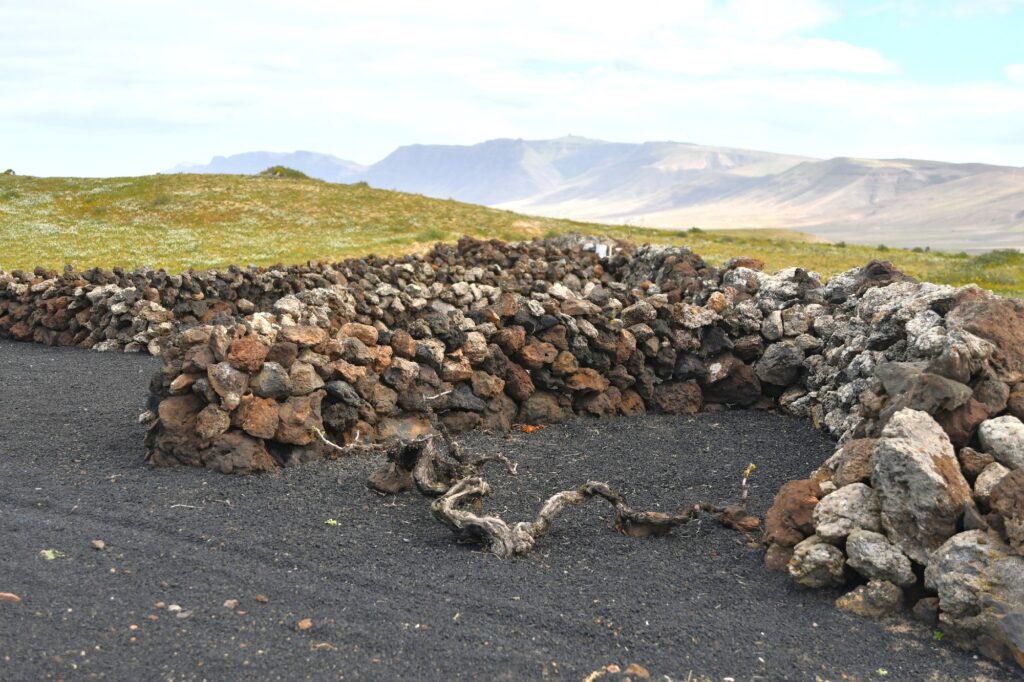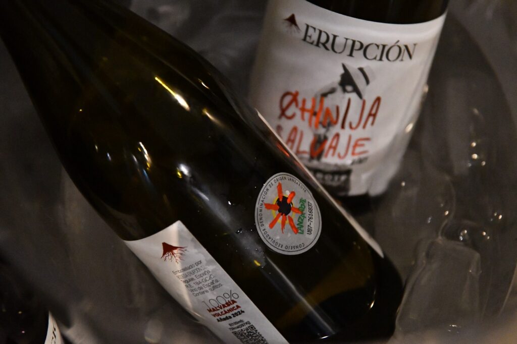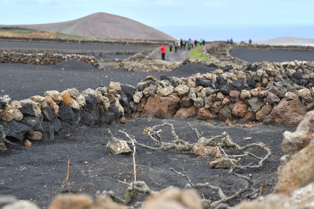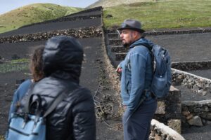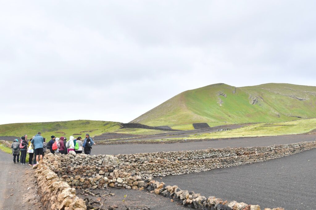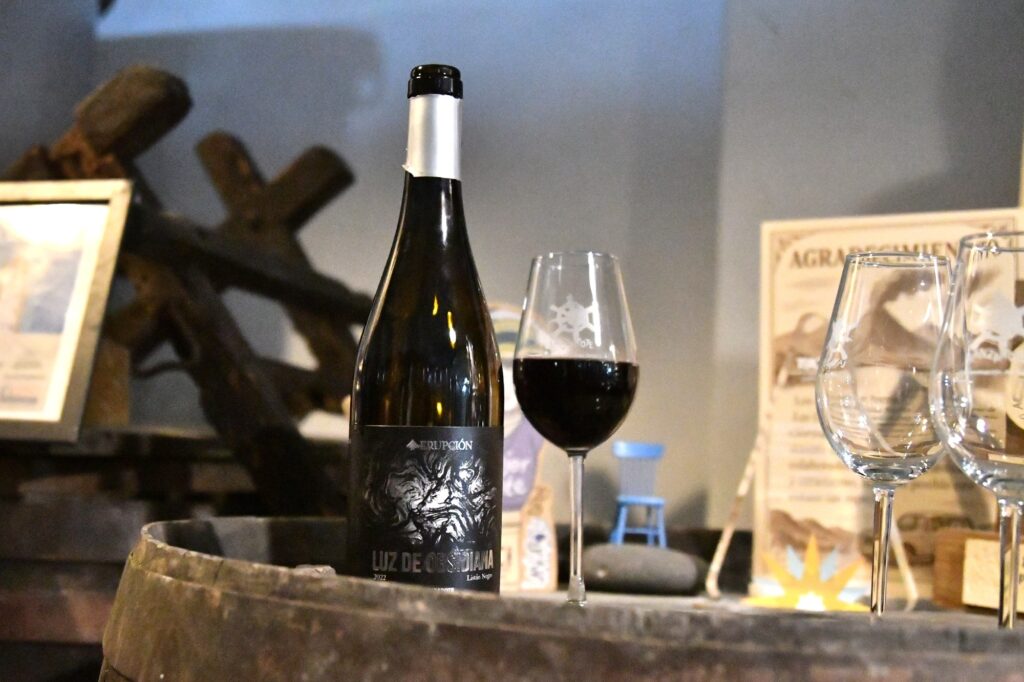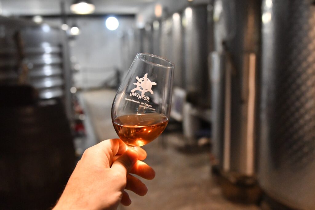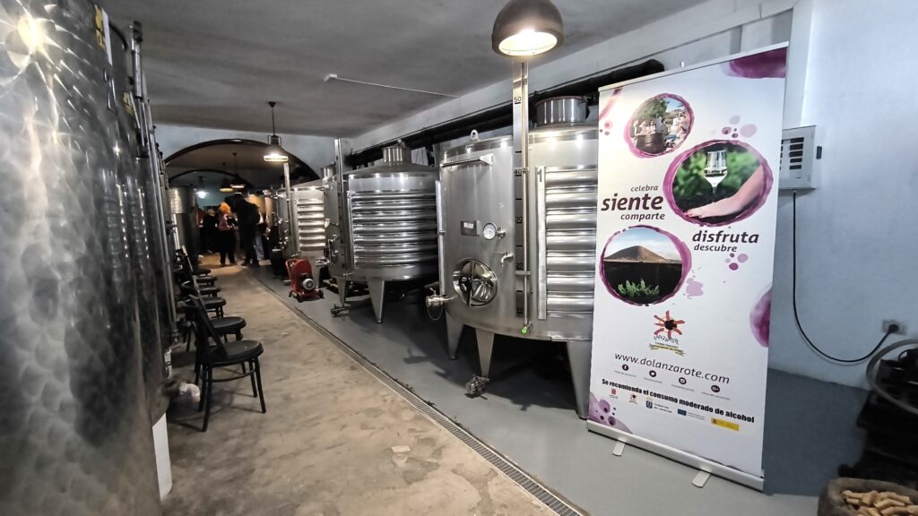 La ruta nos llevó también por Tiagua hasta llegar a El Jable, donde pudimos observar de cerca el último volcán que tuvo actividad en Lanzarote en 1824. Desde este punto tan simbólico pusimos rumbo a nuestro destino final: Bodega Erupción. Allí nos esperaba Amor López, enóloga y directora de este proyecto que representa un bonito relevo generacional. Con ella descubrimos más sobre su visión de la elaboración de vinos, la viticultura en la isla y los varietales autóctonos con los que da forma a sus joyitas enológicas. Y como toda buena ruta merece un gran final… llegó el momento de la cata 🍷