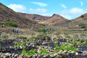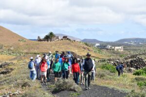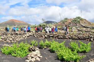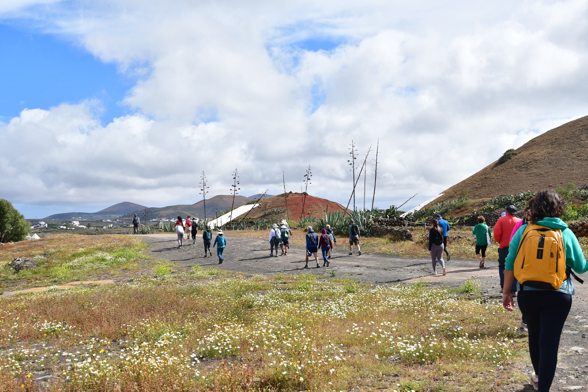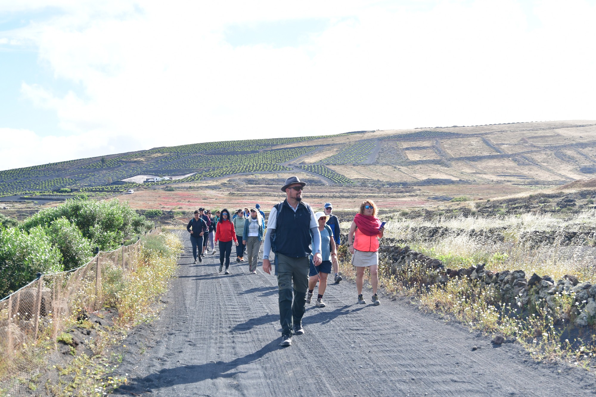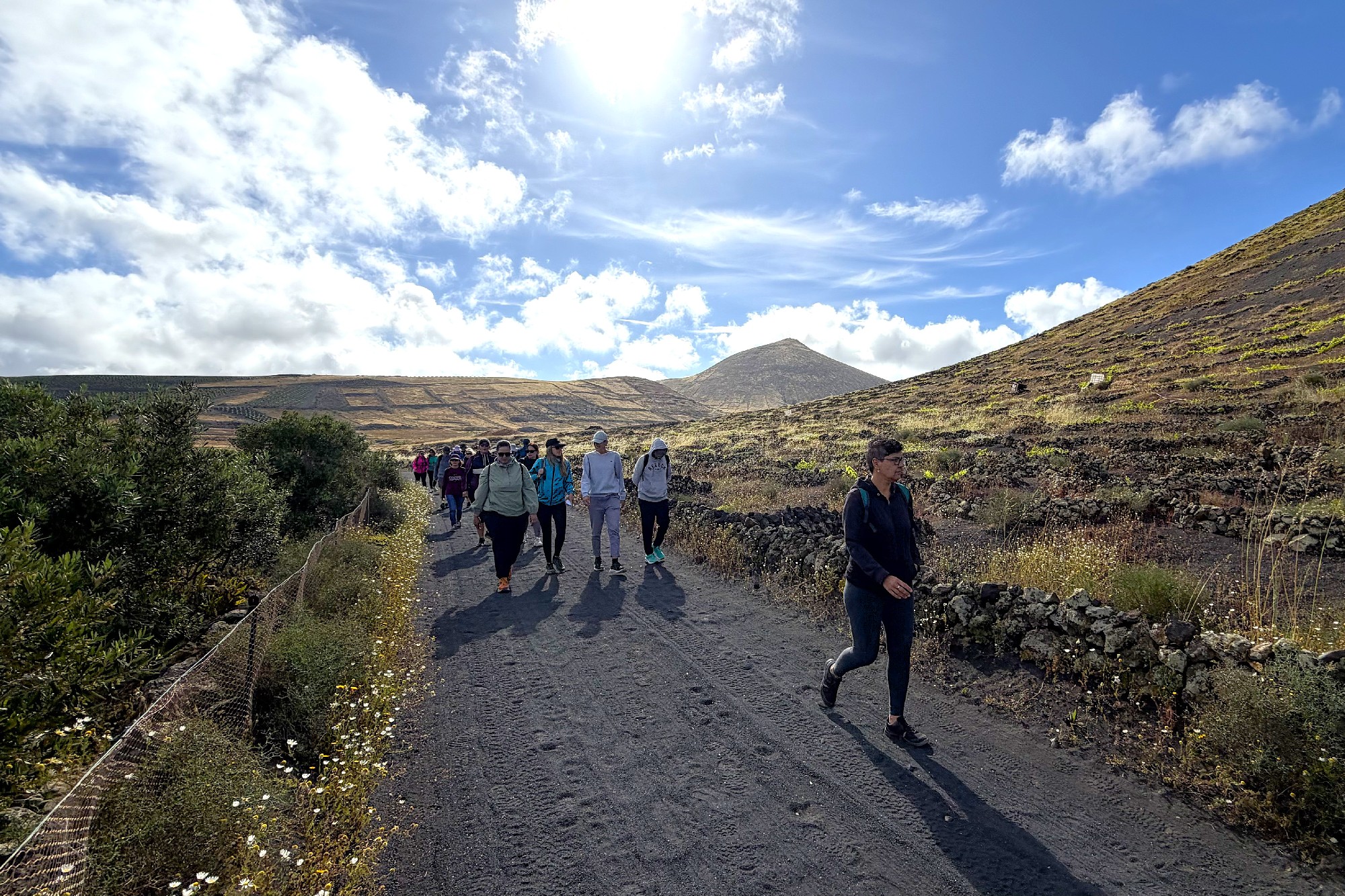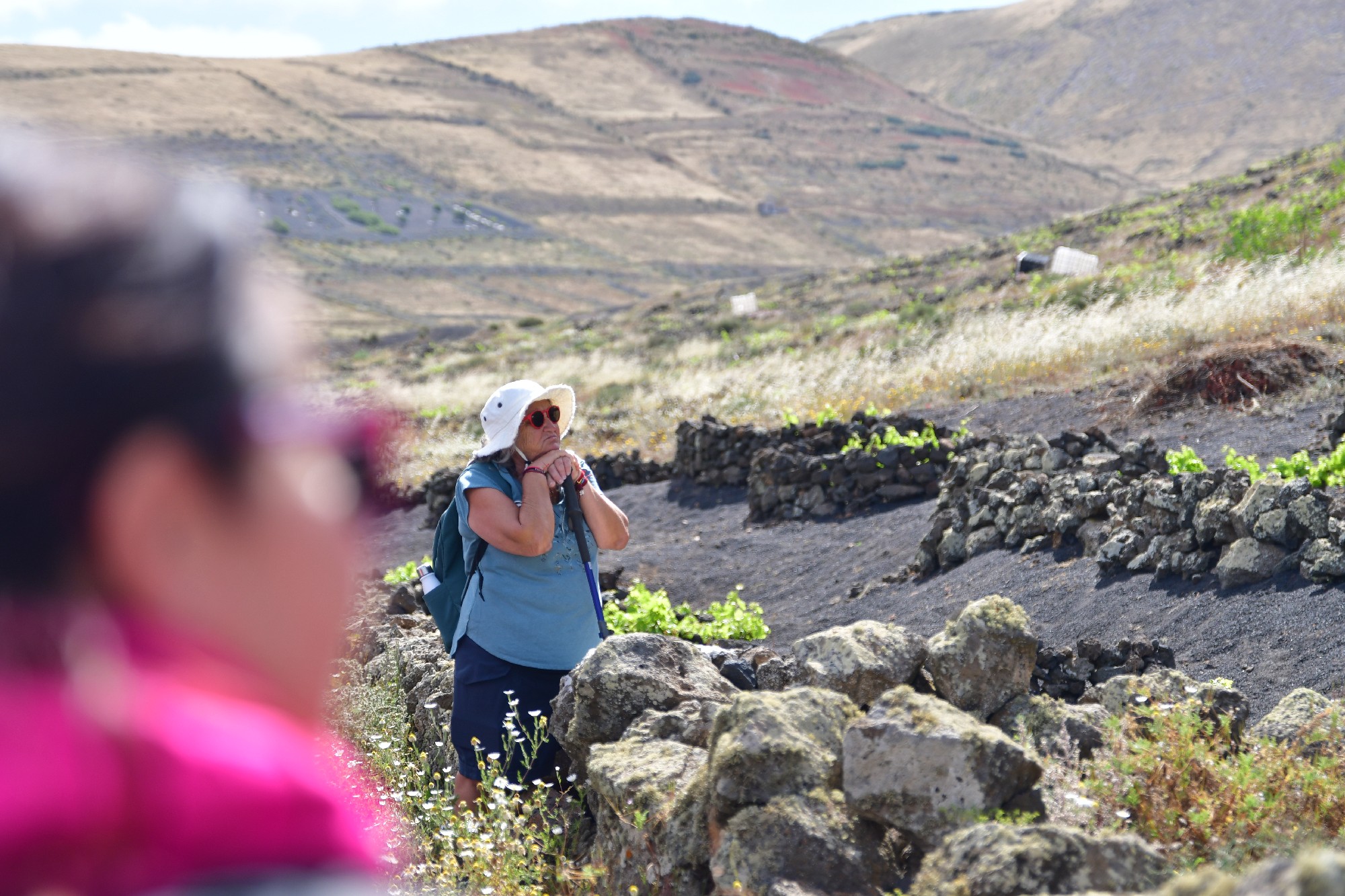 De la mano de Nacho Romero de Senderismo Lanzarote, partimos desde Las Huertas y El Oratorio para adentrarnos en un entorno donde el trabajo del hombre y la fuerza de la naturaleza se funden en perfecta armonía. Ascendimos hasta el Lomo de Tesa, un punto privilegiado desde el que contemplar el paisaje vitícola de Lanzarote. Durante los diferentes senderos pudimos observar dos tipos de cultivos de parras predominantes: en hoyos y en zanjas, y vimos las viñas muy frondosas  con los racimos brotando en su primera fase.